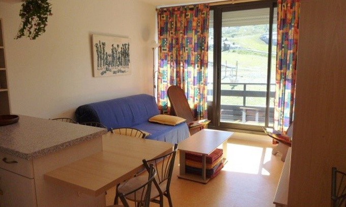 Apartment for 6 people, on the 6th floor of the Pescamou residence, with direct access to the shopping mall and the slopes. Residence with elevator from the mall. Your property is composed of an entrance with a bunk bed, 2 single beds, the living room with fitted kitchenette and dining area, a 2-seater sofa bed, a bedroom with 1 double bed, a shower room, separate toilet and a balcony with a view of the slopes.