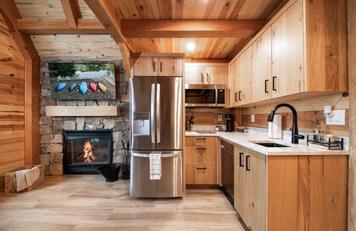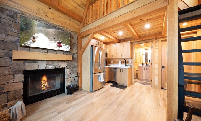 Perfect for a romantic getaway or a small family, this cabin takes in the picturesque lake views that can be enjoyed during any season. Spend your time discovering hiking trails around the property, fishing in one of our lakes, or exploring the charming town nearby, this cozy oasis will welcome you home at the end of the day. Enjoy a peaceful evening under the stars around your private fire pit or take in the views from your porch during your morning cup of coffee. This cabin is PET FREE