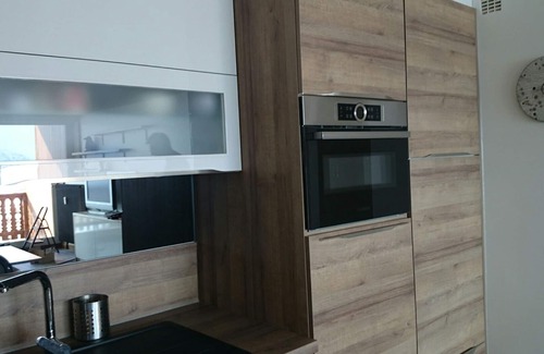 A large living room 30 m² with good quality new 140 cm sofa bed, club armchair; new fitted kitchen, light gray lacquered and wood, new appliances, dishwasher, 3 induction hobs, large fridge, microwave combination oven, Senséo coffee maker, toaster, electric kettle, raclette / pierrade and fondue appliances.