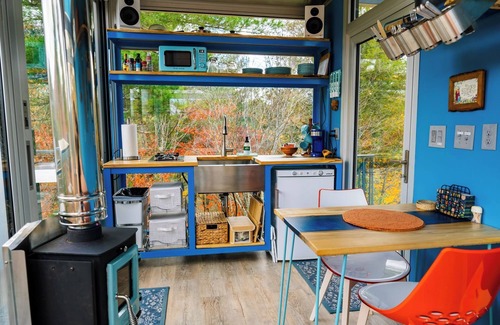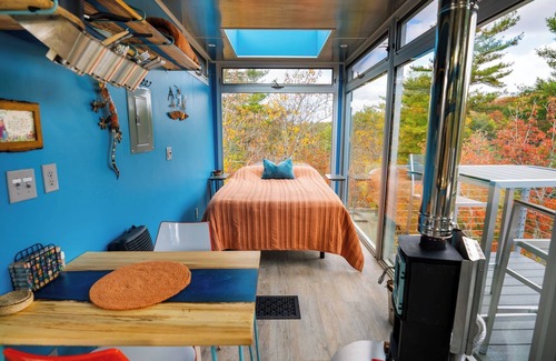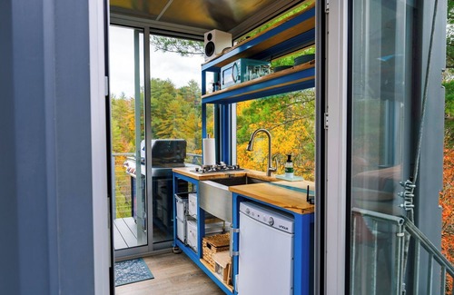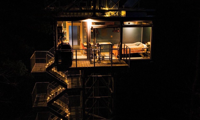 Rising 60 feet above the forest floor, this extraordinary structure is crafted from two shipping containers, referred to as "cabs". Inside, you'll find all the comforts you need, including a kitchenette, a cozy living area, a comfortable bed in the main cab, and a full bathroom thoughtfully housed in a second cabin. The Lookout is equipped with running water from a well, propane wall heaters, and even a mini wood burning stove to keep you warm during those cool mountain evenings. For eco-conscious guests, electricity is supplied by a solar panel system, ensuring a minimal environmental footprint.