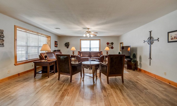 'The Lakeside Retreat' is your new go-to Kingston destination for family reunions or celebrations near Lake Texoma. Easily park your vehicles or boat in the driveway and make your way inside to enjoy this well-appointed 3,000-square-foot home!