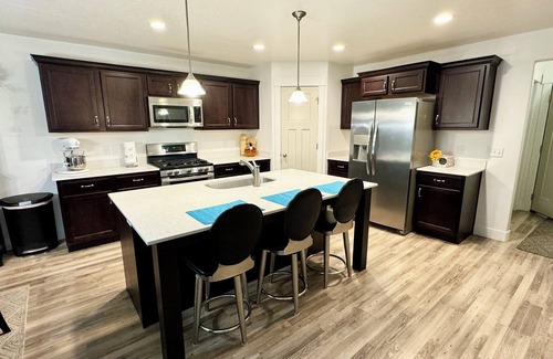 Your home away from home in Draper with 6 bedrooms. This cool house features 2 king beds, 3 queen beds, and 1 twin bed, perfect for families or groups of friends. Melt into our HUGE 9 PERSON HOT TUB after a fun day skiing or adventuring. Breathe the the crisp mountain air or challenge friends and family to games in the arcade. With 4 bathrooms and even 2 offering amenities like a a warmed-seat bidet, guests will feel enchanted by comfort and convenience. Whether you're looking for a relaxing getaway or a fun-filled adventure, our place is equipped for both long or short stays to make your holiday one to remember.