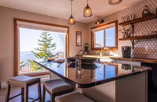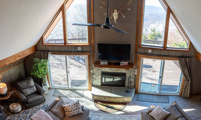 Point of View is a 6 bedroom, 4 bathroom home with incredible views and 4,262 square feet of living space - there is plenty of room for families or groups of friends to spend time together yet still have separate areas for relaxation. There are two wood burning fireplaces so you can enjoy the beautiful views from the cozy warmth of the house. There’s a spacious heated entry room for all of your ski and snowboarding gear, a rec room with foosball table and 65” TV, a cozy loft for relaxing and enjoying the valley views, and a well stocked kitchen for eating in. The deck has a dining table, fire pit and hot tub and is great to enjoy the valley and mountain views, incredible sunsets, and stars that seem close enough to touch. The driveway is steep but is plowed regularly and has flat space at the top for four vehicles with additional parking at the bottom. Four wheel drive is strongly recommended. There is WiFi and a mini cell tower that provides Verizon service for the entire house. The on call shuttle picks up at the end of the road (three minute walk) for a free round trip ride to Silver Creek or anywhere at Snowshoe. The house is located on North West Ridge Road and is a short 150 yard walk to Shay’s Revenge and Cupp Run for the more experienced skiers. Snowshoe Resort has so much to offer in every season and there is always something for every age group to enjoy!