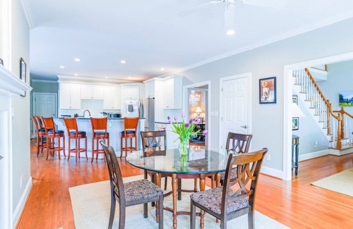 3 story, 7 BR house 250 yards from Sedgefield’s clubhouse overlooking the historic driving range. 2020 kitchen renovation. 2021 back deck expansion with brand new hot tub cleaned after each guest. Complete with pool table, ping pong table, & game room. Your kids will love it. Master bathroom has jacuzzi tub. Twin over Full bunks in two rooms means there are 10 beds for use. No parties or events.