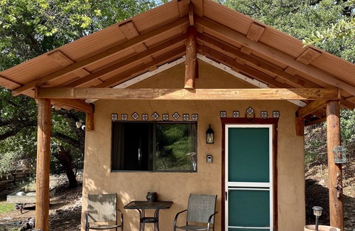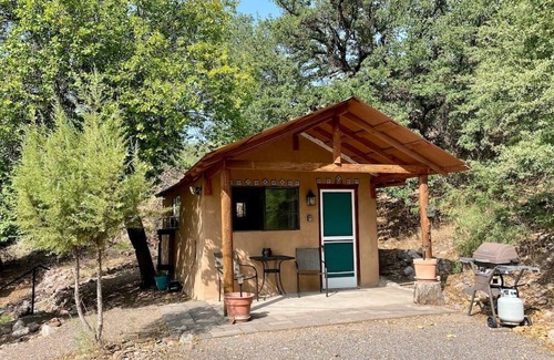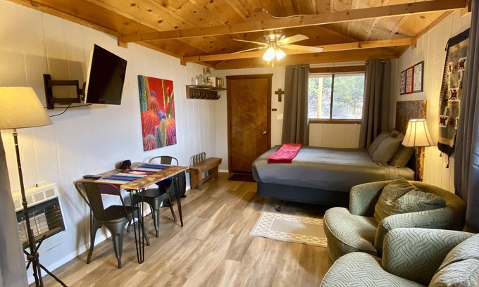 This unique newly remodeled secluded stucco cabin is surrounded by the Gila Wilderness. Nestled at the base of the mountain, it is the perfect lovers' getaway. The one-room cabin is cozy and comfortable - and tastefully furnished with artwork depicting the local area. The kitchen has a refrigerator, stove, microwave, and coffeepot. It comes equipped with dishes and pots and pans. Your private patio is the perfect place to enjoy a glass of wine while soaking in the sunset colors - all while enjoying the gas fire pit in your Adirondack chairs.