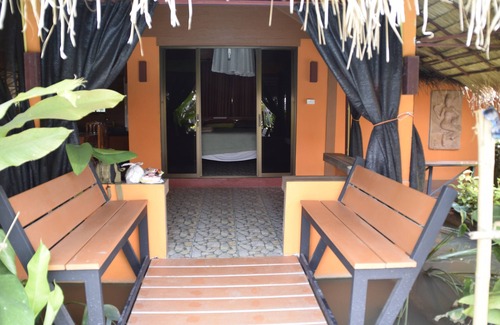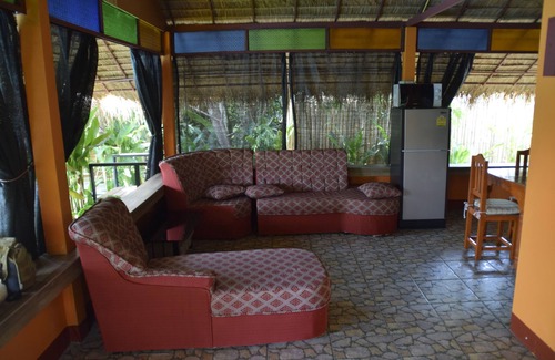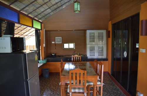 This poolside bungalow was built in 2015 adjoining the large salt water pool...2 to 3 steps away! Nothing is between you and the pool other than greenery!! Within easy sight of a gently cascading waterfall. Features open air lounge/sitting area and connecting kitchen with refrig, micro, Thai hot pot for tea and coffee, and all utensils, dishes and glassware--all the items necessary for a complete kitchen. Air conditioned bedroom with ensuite bath with tub and shower.