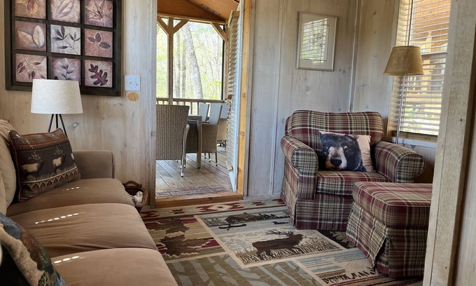 High Country Haven Camping and Cabins is a beautiful back to nature mountain experience. Located in Franklin NC 7 mins to downtown. 35-45 minutes to Bryson City, Dillsboro and Sylvia. This 1 bed queen 1 full bath with shower and tub. This cabin perfect getaway for a clean and cozy stay! Full kitchen, dining room and living room. Can sleep extra people on couch or queen air mattress for loft short ceiling good for kids. You will find cabin lodge decor welcoming to the mountains for your stay.