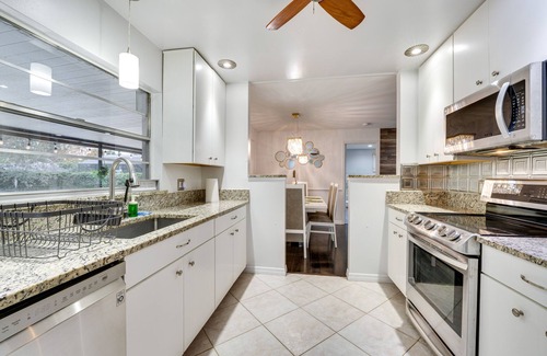 KITCHEN: Stainless steel appliances w/ dishwasher, cooking basics, dishware/flatware, microwave