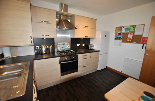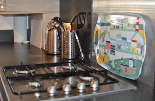 Relax in the bright lounge which has views towards the sea or enjoy a meal or game of cards at the dining table. With wifi and an alexa as well as flat screen TV, you'll be able to kick back after a day exploring. The well equipped kitchen has an additional seating area to grab a bite to eat or sit and chat with the designated cook!