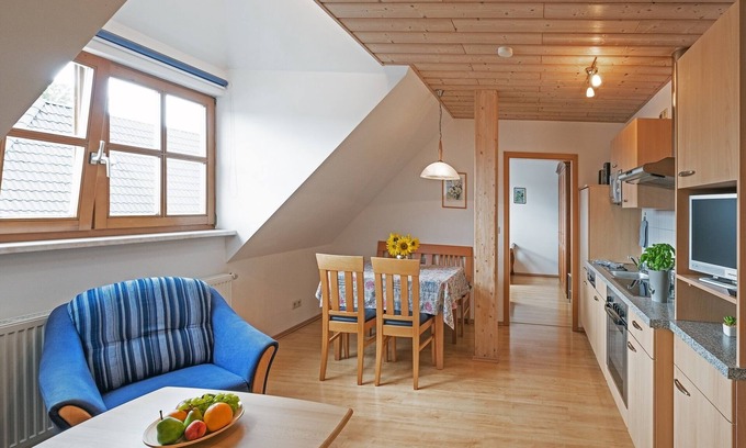 Die Ferienwohnung befindet sich abseits von Trubel und Hektik der modernen Welt und doch nur 5 km von der Stadt Wunsiedel entfernt. Auch die Festspielstadt Bayreuth und das tschechische Bäderdreieck sind für einen Ausflug gut erreichbar. Die 70qm-große Ferienwohnung befindet sich im Dachgeschoss. Zwei großzügige Schlafzimmer (Doppelbett, getrennte Betten) bieten auch Platz für ein Kinderbettchen. Die Küche ist komplett ausgestattet (z.B. Mikrowelle, Geschirrspüler, Wasserkocher, Ceran-Kochfeld) und im gemütlichen Essbereich sitzt man gerne beieinander. Sofa, Sessel und TV sind natürlich ebenfalls vorhanden. Dusche und WC sind getrennt und im Eingangsbereich können Jacken und Schuhe abgelegt werden. Parkplatz und WLAN sind im Preis enthalten.