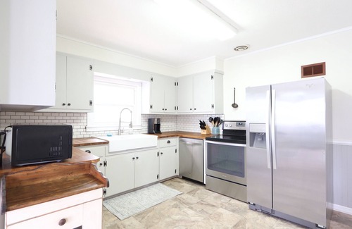 You enter the house into the entry and dining area, with seating for six at the dining room table. All dinnerware is provided for your convenience. As you continue through the house, you enter the newly remodeled kitchen. The brand new appliances include a fridge, dishwasher, and stove. There is also a microwave, coffee maker, and toaster for your use. In the cabinets, you will find pots, pans, silverware, glassware, and baking ware.