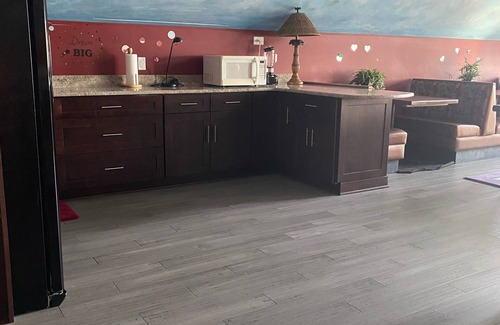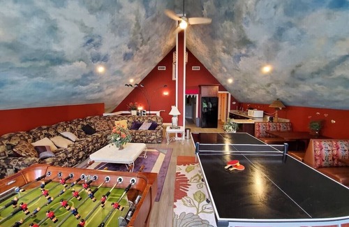 Has a lot of amenities such as pool table, ping pong table, foosball table, air hockey and Vegas style card table with chips. Plenty of room for everyone to spread out and have fun.