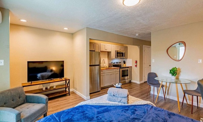 Whether you're here for work or play, our studio provides the perfect home away from home. Stay connected with high-speed WiFi and get your work done efficiently at our designated work desk. After a long day, unwind by streaming your favorite shows on the flat-screen TV or melt away stress in our luxurious rainfall shower.
