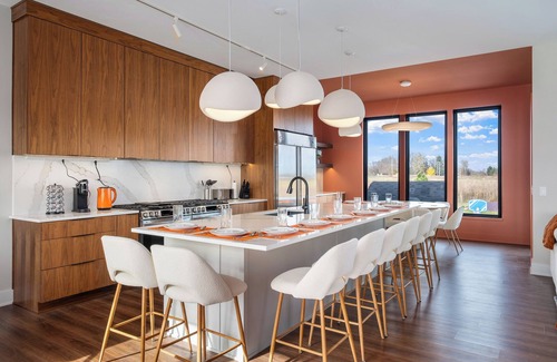 And the best part? There's plenty of seating for everyone! The long island with the coziest chairs and beautiful dimmable chandeliers sits 12 people and a dining table net to it can accommodate another 6!