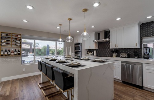 As soon as you walk inside the kitchen, you’ll notice built-in Samsung appliances, a new Samsung refrigerator, and a 36" induction cooktop. You also have a custom 8-person quartz waterfall island table in the kitchen.