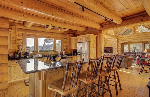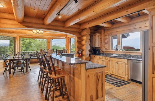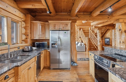Your comfort and enjoyment are paramount in this architecturally stunning lodge made from hand-cut mountain logs. The spacious open living area features vaulted ceilings and exposed beams, while each of the seven bedrooms boasts its own private bathroom, providing both privacy and convenience. Entertain your guests in the expansive great room or challenge them to a game in the recreation room equipped with a pool table and arcade games. The cabin also includes a fully stocked kitchen and dining areas, ensuring you have everything needed for memorable meals and festivities.