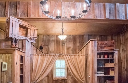 Step into a secluded Western barn made from turn of the century barn wood. This cabin is complete with a two-person, heart-shaped Jacuzzi tub inset behind burlap drapes and just steps away from a comfy, queen-sized bed. The headboard is an actual aluminum pasture gate. Venture out onto the back porch and enjoy the sounds of the great outdoors on porch rockers. Or, enjoy your very own private, oversized shower stall for two, with an outdoor feel. Then select a Western novel from our book collection and relax on the ranch chairs — or make your own cowboy adventure of romance and relaxation. Breakfast is included.