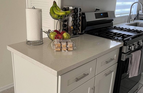 Our 8-unit building boasts a modern, open style with airy, tree-lined covered walkways and stairs. Each apartment has separate outside entrances, ensuring privacy and ease of access. Please note, we don’t have elevators, and the first floor is above grade level, so guests will need to climb stairs. The open and inviting atmosphere without enclosed walkways is a beloved feature among our guests.