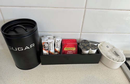 Kitchen: Fully equipped with a stove, oven, microwave, pots, and more. Essentials like herbs, salt, foil, tea, coffee, and sugar are provided.