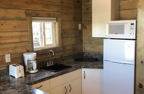 Cabin #1 offers a kitchen stocked with dinner ware, pot and pan, utensils, toaster, coffee maker, and outdoor grill. Relax in a bed room that has a custom built queen log bed with a memory foam mattress. It has a fully furnished bathroom that provides a full tub and shower. All linens and towels are provided.