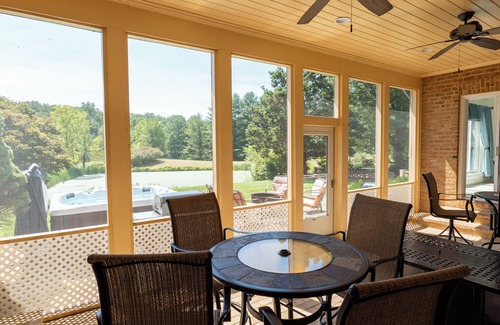 Castleton Farms is a sprawling, 500-acre compound at the foothills of the Blue Ridge Mountains and Shenandoah National Park with a working animal farm, fishing ponds, and gorgeous views. A five-mile paved footpath spans the property and is perfect for walking, jogging, or biking. Visit the friendly menagerie with emus, goats, chickens, pig, donkeys, a zebra, and a zonkey. The magnificent Pool House complex boasts a custom, geothermally-heated indoor pool, and hot tub, (Additional fee — paid at check-in).