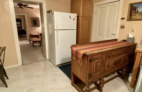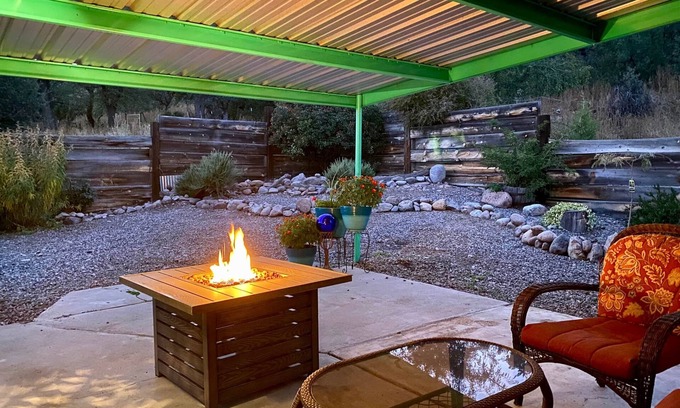 -The home has two separate bedrooms with a king-sized bed in the back bedroom and a queen-sized bed in the front bedroom.(Due to the age of the home and the additions made throughout the years, the back bedroom accesses the rest of the home through either the front bedroom - or through the outside front patio). The couch in living room makes out into a queen-size bed - for three beds total in the unit.There is a spacious kitchen which includes a refrigerator, stove, microwave, 12-C Mr Coffee dripcoffee pot, blender, spices, dishes, and pots and pans for your use. The home also has a light and bright cozy sunroom to enjoy sipping your coffee from and enjoying your unobstructed view of the Mogollon mountain range. A washer and dryer is also available for your use. The living room has a couch and recliner, Smart TV with Dish satellite, and a bookcase to browse books about the local area. The large covered front porch has a table and chairs and lots of room to enjoy spreading out and enjoying the fresh air. The back yard has a large covered patio, gas fire pit, tables and chairs, and propane BBQ grill for your use.