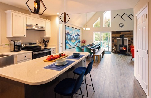 The cabin features four spacious bedrooms, each with a king bed, plus a cozy bunk room that sleeps five, ensuring ample room for everyone involved in your wedding festivities. Enjoy the warm ambiance of the vaulted main room with a wood-burning stove, or take advantage of both indoor and outdoor dining spaces that seat 12 for memorable receptions or rehearsal dinners. The movie room with an 86-inch TV and the game room featuring ping pong and air hockey make it easy to entertain guests in a relaxed environment. Don’t miss the expansive wrap-around deck, perfect for cocktail hours with stunning ridgeline views as your backdrop.