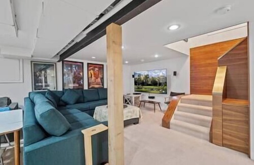 Welcome home! This spacious 4-bedroom home comfortably sleeps 9 guests, perfect for families or groups. Enjoy a king-size bed, a captivating glass staircase, and a unique blend of modern comforts and vintage charm, including a piano and a classic pinball machine.