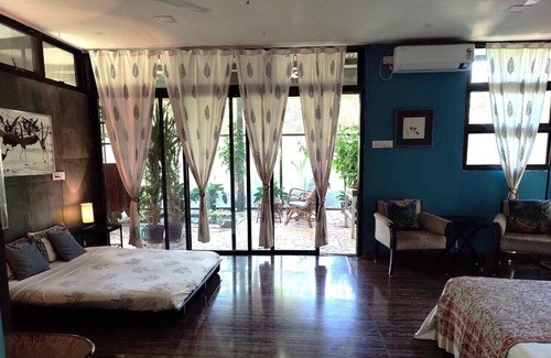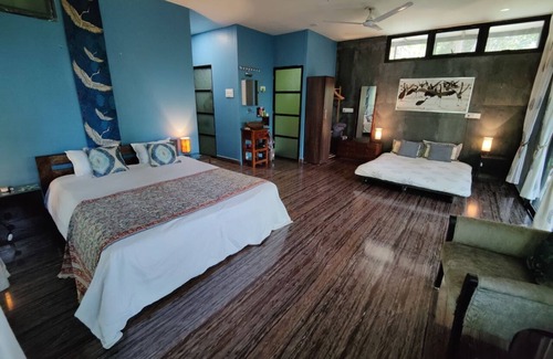 Immerse yourself in nature's lap in this 4-BR, open concept ground floor farmhouse. The floor to ceiling windows offer pool and garden views. Observe Irshalgad from the garden bench, across the orchard. Dive into the 60 foot-long pool or chill in 1 of the 3 shallow areas on hot summer afternoons. Relax in the hammock listening to birds. Watch the kingfisher from the garden swing. Savor local specialties or a succulent poolside BBQ under the stars!