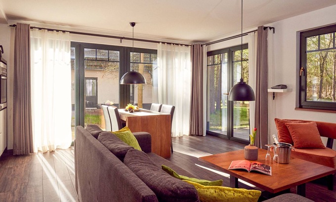 In the heart of the Mecklenburg Lake District, in a beautiful secluded location directly on the idyllic Drewitzer See and in the midst of the nature park Nossentiner-Schwinzer Heide, the cottages are located in a small holiday park - the Van der Valk Naturresort Drewitz. The cottages are modern furnished and offer everything to spend a relaxing and relaxing holiday in the Mecklenburg Lake District. The fireplace, which all holiday homes have, ensures cozy warmth and romantic hours. Enjoy the tranquility of a walk through the forest, the fresh air and the clean water of the lake for swimming and fishing invites. For the well-being, a restaurant with a sun terrace and a wonderful lake view offers culinary delicacies. There is also a modern indoor pool, sauna, a mini golf course and rowing boats, fishing and bike rentals to individually customize your holiday.