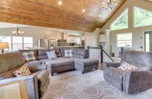 This spacious 4,500 sq ft property boasts nine bedrooms, each with its own bathroom, providing privacy and convenience for all your guests. The expansive decks extend your living space, offering scenic lake and mountain views that serve as a picturesque backdrop for your ceremony or reception. Enjoy amenities such as a fully equipped kitchen, a kitchenette on the lower level, and two laundry rooms for added convenience. Outdoor features include a private dock, a lighted hot tub, and multiple dining areas complemented by gas grills, making it easy to host fun-filled celebrations and gatherings throughout your stay.
