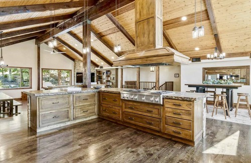 This impressive Lake Tahoe Villa with luxury amenities is situated close to all that Lake Tahoe offers. Sitting on a large, sun-drenched parcel, the home is laid out over 4 floors with beautiful panoramic mountain views, Heavenly ski resort views, and a view of Lake Tahoe. 11 bedrooms were reduced to 9 to offer a private office and gym. The main floor features a 1,500 sq ft Great Room with 16' vaulted ceilings, distressed beams, and solid oak floors. An elevated deck extends from the Great Room, perfect for outdoor dining and cooking with double BBQ grills and side burners. The oversized chef's kitchen includes 2 large refrigerators, a large freezer, separate ice maker, double ovens, 2 microwaves, 2 dishwashers, a 48” gas cooktop with griddle and custom hood, and a walk-in pantry. The kitchen is well stocked with kitchenware, appliances, and cooking tools. It's large enough for several chefs to cook simultaneously. High-quality materials enhance the home throughout, including real slate floors, alder finishes, solid granite, and many custom furnishings. The gym features new NordicTrack machines with 24” screens offering free “iFit” workout programs and access to popular apps like Netflix. The primary bedroom includes an attached bathroom with a double sink vanity and walk-in closet. An additional 5 full baths and 2 half baths are tastefully finished with alder cabinetry, granite, and quality fixtures. A generous lower-level entertainment space is perfect for movies and gaming, including a billiard table, a retro arcade machine with 100+ classic/nostalgic games, and a wet bar with a full-sized fridge. Multiple TVs throughout the home provide Spectrum cable and Roku with free channels and access to your favorite apps. The Wi-Fi mesh network ensures strong connectivity throughout. Other amenities include a large indoor sauna, indoor hot tub, a kids' playroom/bunkbed room, 2 laundry areas with washers and dryers, and a 3-car garage. The home kept warm in the winter through control of three furnace zones and cool in the summer with an evaporator cooler and portable AC units. Nevada Beach is 5 minutes away or a little over 40 minutes if you prefer to walk. Heavenly Village and Gondola are an 8-minute drive. There is a Safeway Grocery story 2 minutes away and walkable in just over 20 minutes.