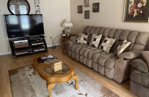 A & B Trail House, a four Bedroom dwelling, with 5 beds Plus 2 Baths, a fully stocked kitchen, four TVs and multiple sized beds. Two large lighted parking areas which are suitable for large trucks and long trailers on site. The lighted carport in back houses ATVs, DIRT BIKES, UTVs and Cars and Trucks. A lighted online workspace is available for all with a compact refrigerator for extra drinks. Patio furniture is housed on a 16x20 [screened-in] porch for outdoor dining and recliners for relaxation. Indoor dining has a fully stocked kitchen enhanced with a microwave blender and toaster. Pots pans utensils plates cups and glasses are present along with dishcloths and cleaning supplies. A coffee nook with a new Keurig and Mr. Coffee. The living room has five reclining units with futon and a 60 in TV. DVDs are abundant and there are numerous magazines for the avid reader. Bedrooms have a King, Queen, Full and 2 Twin-sized beds & a Futon. Plenty of blankets and extra pillows are present. All Bed spaces have a Smart TV and a firestick for streaming numerous programs. FREE WIFI GOES THROUGHOUT THE HOUSE. There’s lighting on both the front and back porches and motion lights, as well. A keyless pad lock is on the back entrance and padlocks are present on all entry doors. Fire alarms are installed and a fire extinguisher is present. Disinfectants are used throughout the unit for health and safety.