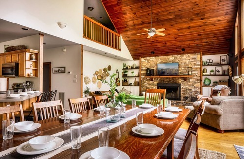 This charming cabin features an open floor plan that invites you to experience the breathtaking views through expansive windows. With amenities such as a fully stocked kitchen perfect for catering large gatherings, a spacious dining area, and multiple living spaces, every aspect of your wedding celebration will be seamlessly accommodated. Guests can unwind in the hot tub or gather around the wood-burning fireplace after a day of festivities. The sleeping arrangements include multiple bedrooms, a cozy loft, and a fun game room with bunk beds, ensuring a comfortable stay for everyone. A large deck and screened-in porch provide additional spaces for relaxation and enjoyment.