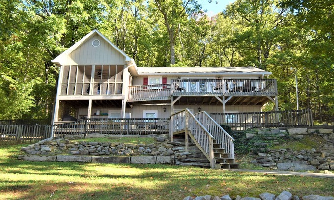 A large 4 bedroom property with full kitchen, 3 full bathrooms, laundry room and a huge family room with plenty of seating and a dining table that seats up to eight. Two smart tvs and internet access. The back of the house has two large decks, a screened in porch and a walkway that leads from the house to the water where a ladder and steps offer access to the lake. Boats and jet skis may be secured to the dock during your stay. The boat launch is a short distance away and has space to park your boat trailer. The boat launch can actually be seen across the lake from our boathouse. The driveway at the house is on an incline and is not suitable for parking of boats and or trailers. Swimming and sunning can be enjoyed around the spacious deck. A short drive or boat ride will take you to Goose Pond Colony with all it has to offer. Multiple restaurants and stores are also a short drive away. This property has a no smoking and no pet policy.