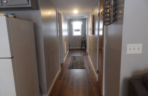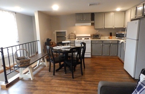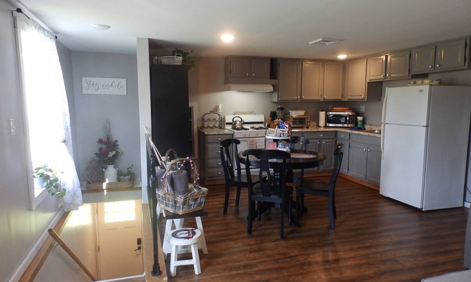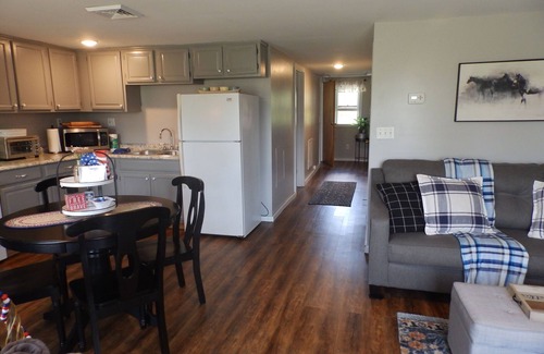 Our recently renovated, dog friendly, farm house apartment is the perfect place to enjoy an over night, long weekend, or for an entire month. There is plenty of space to spread out with an open living space floor plan, with 2 bedrooms and 1 bath. The space sleeps 6 comfortably, with 2 queen beds and 2 singles. Just some of the amenities we offer are, fiber optic wireless wifi, washer and dryer in unit, electric fireplace, covered private patio, and fire pit. We are located centrally to many outdoor activities, no matter the season.