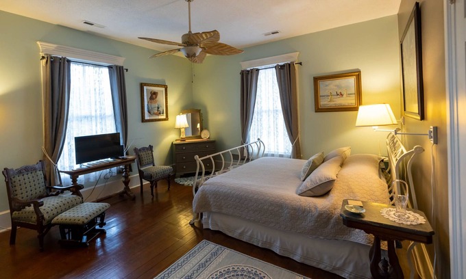 A beautiful large bedroom at When Pigs Fly Inn at the Frank A. Moss House that has hardwood floors, a full private bath and comfy king-sized bed. The house, which is on the Washington Historic Walking Tour, is nestled in the heart of the Washington North Carolina's historic district and only three blocks away from the Downtown Harbor District with it's quaint shops and picturesque waterfront. Park your car at our place and not get in it again til you leave. You can walk almost everywhere. Also, we a cat, Milo. Friendly as he can be.