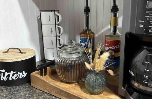 The cabin is a 2 bedroom (full size bed) with one bathroom (Jack and Jill style) between the two rooms. The cabin has a large open living room with a couch which turns into a full size bed for an extra sleeping area. Little Owa has a full size kitchen that is fully stocked with the kitchen items needed to prepare a meal and a coffee bar area.