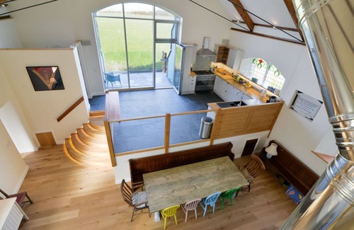 Climb the bespoke stair case to the mezzanine master bedroom - a large, light-flooded space flanked on one side by original stunning stained-glass windows. The original doors to the church have been used as the headboard, again blending old and new seamlessly. A fireman's pole will get you quickly back to the ground floor if you don't fancy taking the stairs. In the original Sunday school wing, you ll find three more good size bedrooms - a king room with an ensuite bathroom, a second king bedroom with a roll top bath in the bedroom, and a twin bedroom.