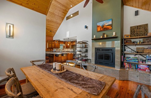 Once inside you'll be pleasantly surprised. The gourmet kitchen is ideal for cooking big family meals with plenty of counter space, an oversized island, and a 48” professional grade 7 burner double-oven range. It opens to the dining area and wood-burning fireplace. The main-floor master suite includes a king-sized bed, TV, a five-piece bathroom with a heated jetted tub, and 6' x 4' double-head shower, and a double vanity. The lower level has a wonderful "Family Bedroom" with 1 queen, 2 full beds, and 1 twin with ensuite 3/4 bathroom, and TV. The French doors from this room open to a patio with a built-in hot tub and beautiful views. Upstairs, glass doors in the living room lead to a 19' x 10' Trex deck with breathtaking views. The vaulted tongue-and-groove ceiling, stone-faced wood-burning fireplace, and granite wet bar make a cozy atmosphere perfect for gathering. The 3rd bedroom is located on this level complete with a Queen bed, TV, and Jack and Jill bathroom. Continue up to the top floor to find the 4th private bedroom with a Queen bed, TV, ensuite bathroom, and blow-up air mattress. Whatever your ideal vacation, we promise that you will be relaxing in no time in our special piece of paradise.