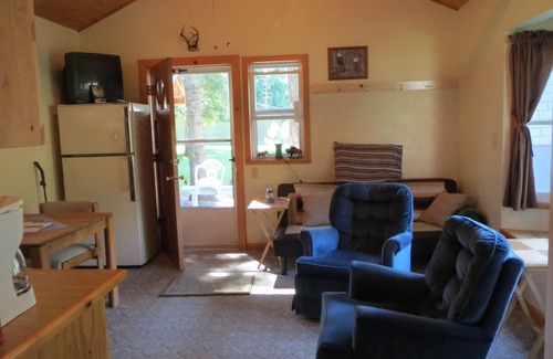 Vacation cabin nestled in the trees on the banks of the Kootenai River with dock and float to tie your boat up. Come catch a trophy Rainbow Trout! This is a great summer retreat and playground. Cabin has one double bed, kitchen area microwave, and linens for bed and bathroom. There is a fire pit with wood to burn (campfire in the evening), picnic table, and gas barbecue for cooking. RV site available with cabin for extra fee if used with cabin. Cabin is closed October 15 to April 1.