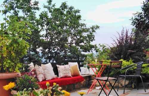 This stone 100 sq meters home has a large living room with a fireplace, an adjoining dining area-kitchen and a fully equipped bathroom on the main level and 2 bedrooms on the upper level. The living room is comfortably furnished and the bedrooms are newly furnished with comfortable beds, linens and duvets. The Kitchen and the dining table will seat 8 people at meal times. In the kitcen you will find wooden countertops and all you may need for preparing meals. Other features include TV & DVD & WIFI internet connection. There are art works and art instalations in the house.