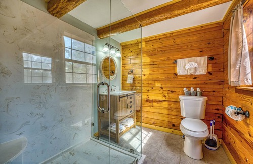 The warm and welcoming living room features a wood-burning fireplace, perfect for relaxing after a day of outdoor adventure. Step outside to enjoy a true cabin experience with an outdoor grill for evening supper and a fire pit for a cozy night under the stars.