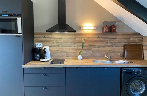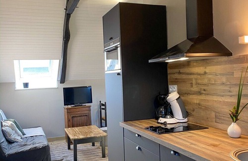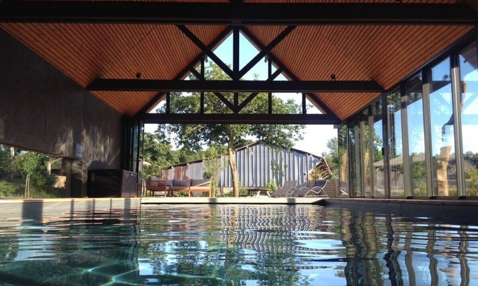 In the DOMAINE DU GRENIER, in an old renovated farmhouse, your entire private apartment is on the 1st floor, with a beautiful view of the courtyard and the park. You have free access to all facilities, terraces, indoor heated swimming pool and sauna. Electric bike rentals.