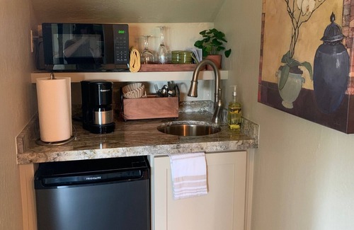 There is a sink, microwave, refrigerator and coffee maker located in the loft.