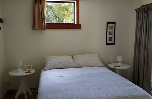 A private apartment featuring queen bed in separate room with ranch sliders on to patio, 2 x sofas, log fire and full kitchen with small table. A large bathroom with shower, toilet and basin. The ranch slider doors open on to a small private lawn above a beautiful forest stream.
