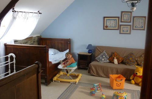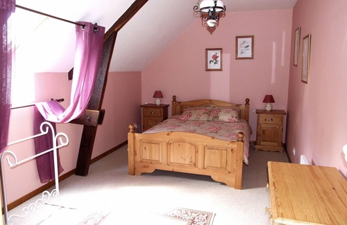 Chained Heart Cottage can also be rented with Bishops Well and The Coach House to accommodate 22 people. perfect for family reunions and large groups enjoying a holiday together. A log fire and central heating makes this an ideal location for Spring and Autumn breaks. The accommodation sleeps 8+ in four bedrooms. It consists, on the ground floor, of a spacious American-style well-equipped kitchen lounge/dining room featuring an attractive stone fireplace and master bedroom with en-suite bathroom (bath/shower) and washing machine. Upstairs there is a double and a twin bedrooms and a third airy bedroom with 3 "lits coins", traditional carved Breton beds. There is a shared upstairs bathroom with shower cubicle.
