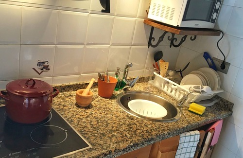The kitchen is complete with all the elements for cooking. No oven. If you have a microwave.