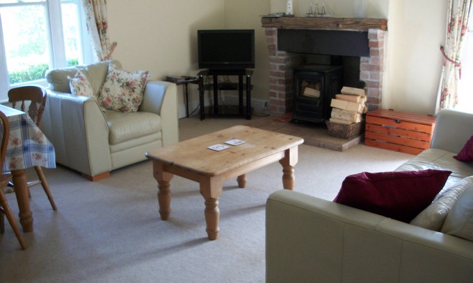 The large traditional sitting room has a log burner, television with Freesat, pine dining table and chairs, two settees and an armchair. The house is well equipped to a high standard. The French doors, which are the entrance, open onto a stepped patio. The small, stepped patio with table and chairs is ideal for evening barbecues.