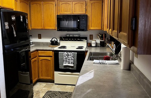 This is a 2 bedroom/2 bath home but also offers a futon in the game room for sleeping as well as a queen size air mattress if needed! In addition a sleeping cabin has been added outside with a queen bedand twin trundle to hold an additional 1-3 guests. Cute and comfortable there is a 6 person dining table as well as seats at the counter. Full kitchen with coffee station (kurig) and outdoor dining table as well in summer months. Great wifi service and tv with unlimited viewing options.